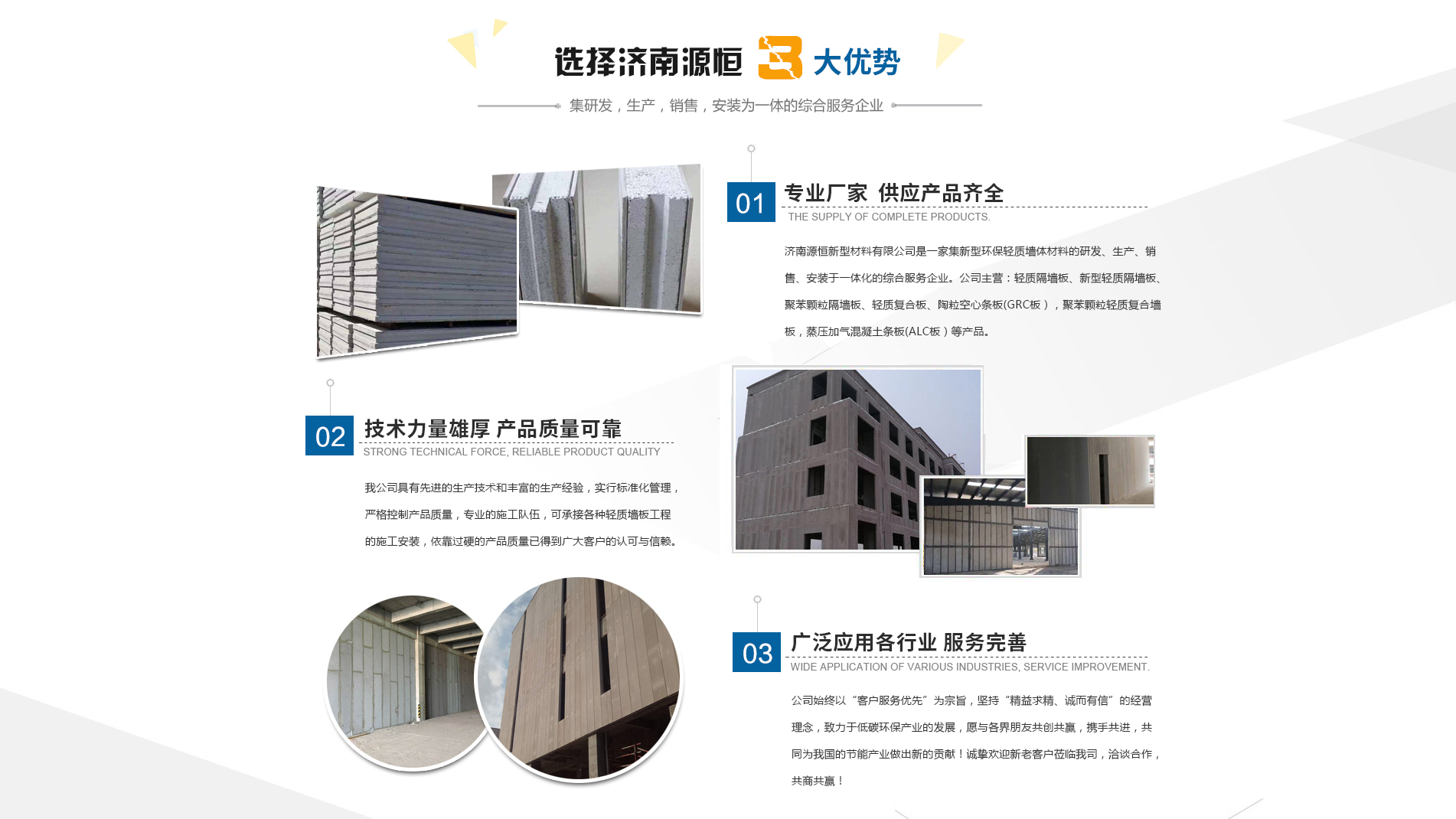濟南源恒新型材料有限公司坐落于美麗的泉城濟南,是集新型環(huán)保輕質墻體材料的研發(fā)、生產(chǎn)、銷售、安裝于一體化的綜合服務企業(yè)。我公司具有的生產(chǎn)技術和豐富的生產(chǎn)經(jīng)驗,為您提供輕質隔墻板、新型輕質隔墻板、聚苯顆粒隔墻板、輕質復合板、陶粒空心條板(GRC板),聚苯顆粒輕質復合墻板,蒸壓加氣混凝土條板(ALC板)等產(chǎn)品,本公司有專的施工隊伍,可承接各種輕質墻板工程的施工安裝。輕質隔墻板是國家推廣使用的新型輕質、綠色無害建材,是墻改節(jié)能政策大力扶持的環(huán)保節(jié)能產(chǎn)品,是發(fā)達國家普遍采用的新型墻體材料。濟南源恒新型材料有限公司實行標準化管理,嚴格控制產(chǎn)品質量,依靠過硬的產(chǎn)品質量已得到廣大客戶的認可與信賴。公司產(chǎn)品遍布各大城市,與國內(nèi)多家客戶建立了良好的合作關系。公司始終以“客戶服務優(yōu)先”為宗旨,堅持“精益求精、誠而有信”的經(jīng)營理念,致力于低碳環(huán)保產(chǎn)業(yè)的發(fā)展,愿與各界朋友共創(chuàng)共贏,攜手共進,共同為我國的節(jié)能產(chǎn)業(yè)做出新的...